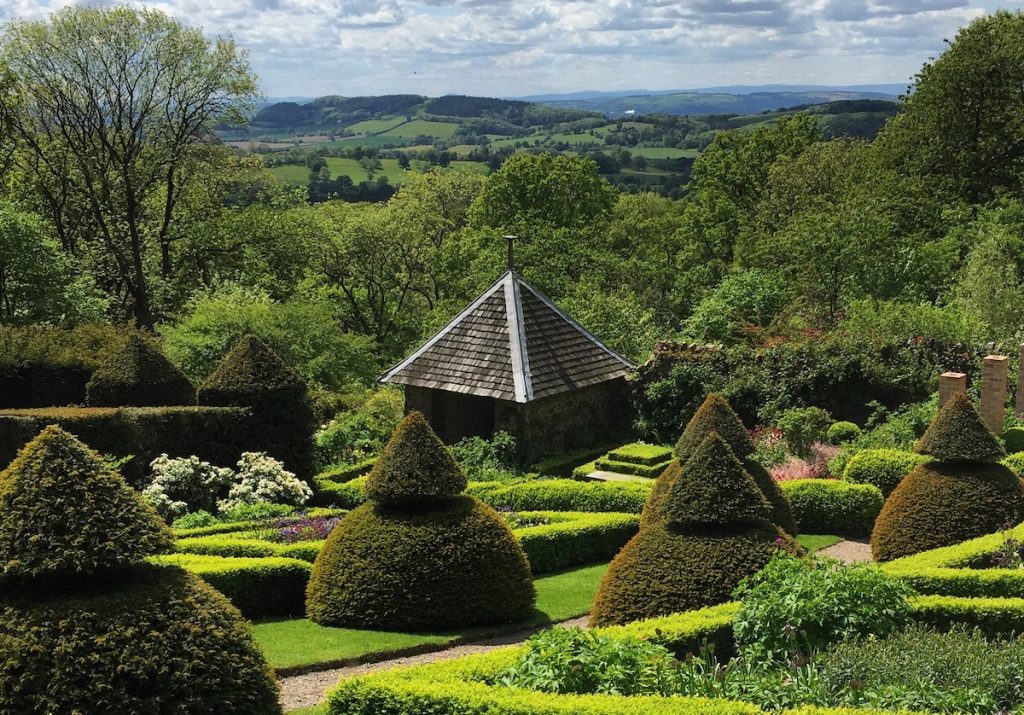 Two detailed drawings exist for the garden at Perrycroft, one for a section of the walled garden and the other for the Summer House, both positioned to the west of the house at the bottom of a square sloping garden which is enclosed on two sides by tall yew hedges and on the other two by sturdy Malvern stone walls. Beyond this enclosed garden a Voysey designed gate and pergola lead to an oak woodland. Standing at the top of this small formal garden beautiful far reaching views can be enjoyed across Herefordshire and on a good day into Wales. There are no planting plans for this part of the garden, and except for the yew hedges no original plants remain, but this has now been planted as befits an Arts and Crafts garden, with box hedges, yew topiary and cottage garden plants.